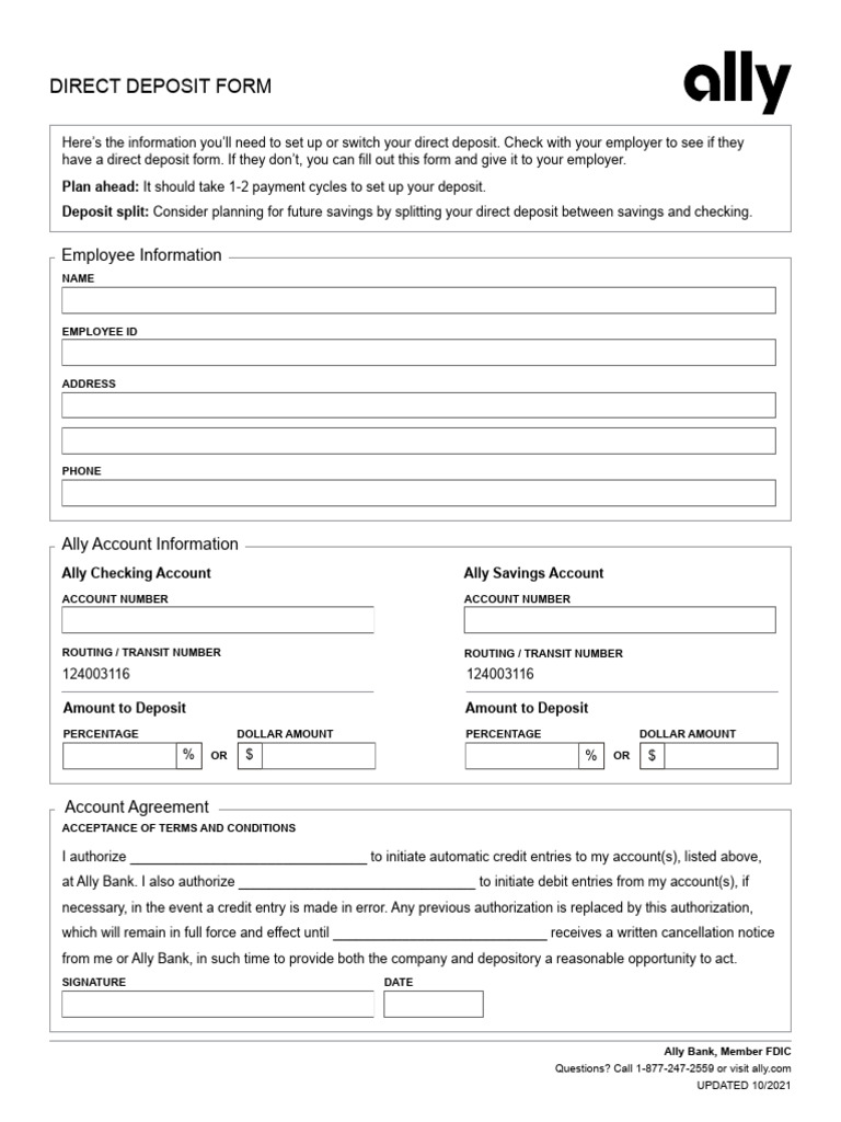 Ally Direct Deposit Form - Over 8,000,000 people already rely on ally to provide respectful support, security you can trust, and a. Securely manage your ally auto account online, make payments, and access essential features conveniently from one platform. Manage your ally vehicle account online. Banking built on a foundation of meaningful features. Enroll online to manage your ally credit card account from anywhere. Check your fico score, review transactions, schedule payments and more. Online banking, auto financing, and investments. Manage your money with ally: Download the ally app to get started. Financial products designed to help you pursue your goals.