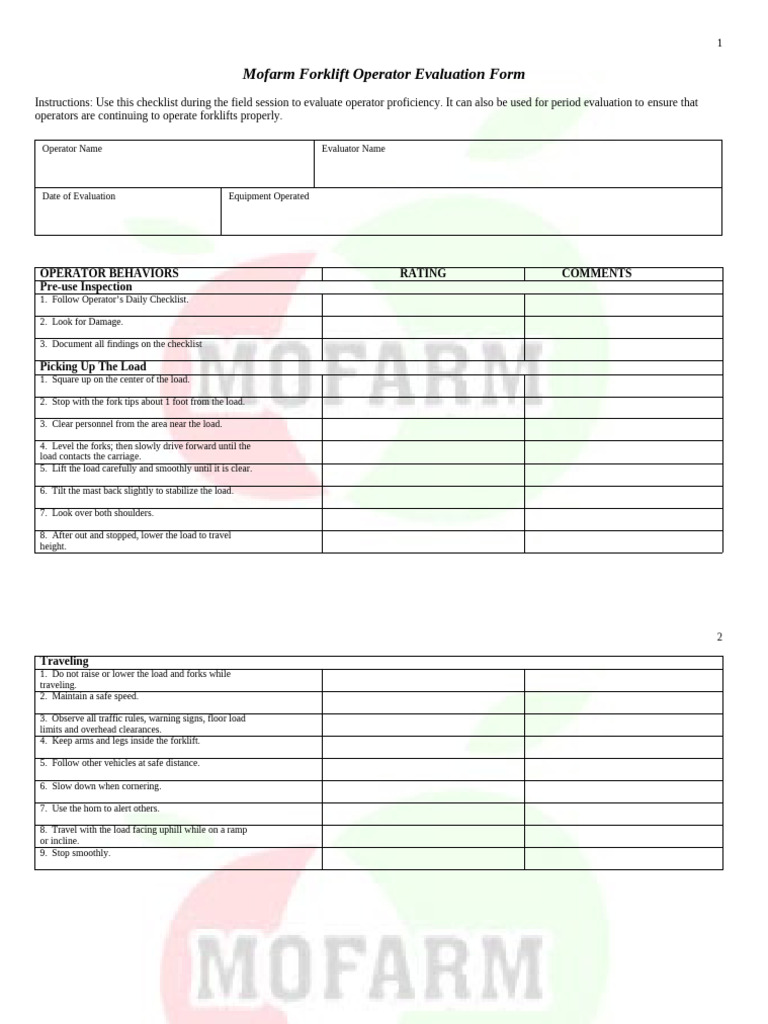 Download or preview 2 pages of pdf version of forklift operator evaluation form (doc: Use this checklist during the field session to evaluate operator proficiency. It can also be used for. Explain all items needing attenion and/or additional training on back of this page. Based upon my evaluation, the operator is qualified to operate the above described equipment.