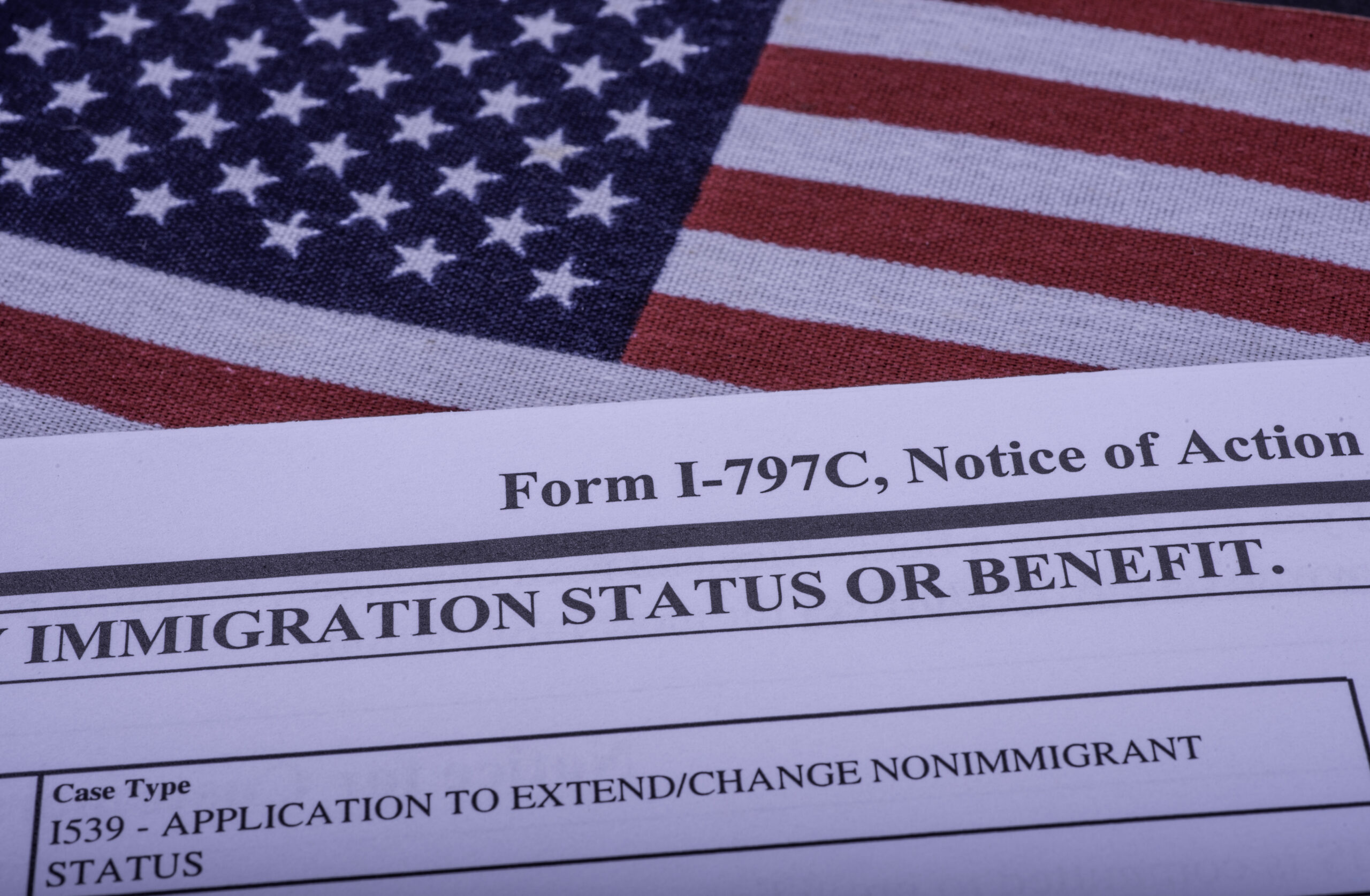 Form I 797C (Notice of action, immigration status) on flag of USA